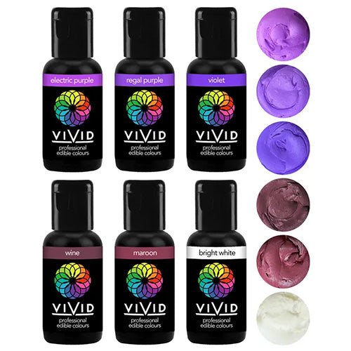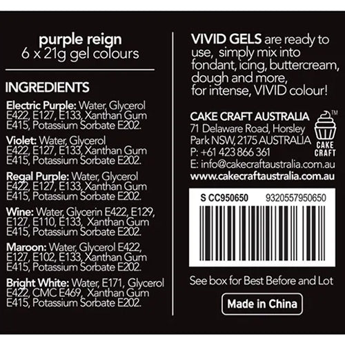 This Vivid Gel Colours Purple Reign 6 Pack includes 6 x gel food colours:
