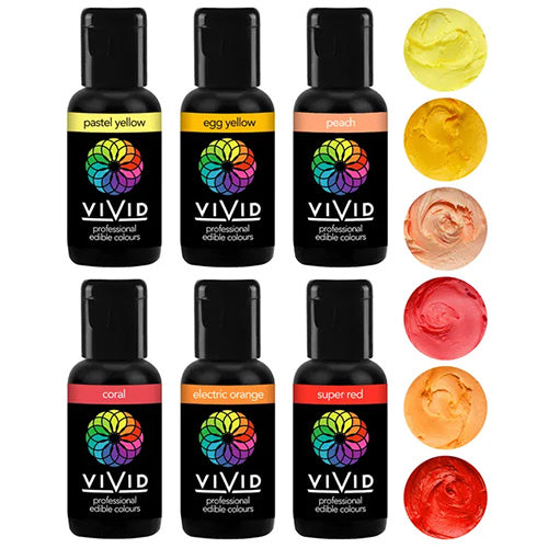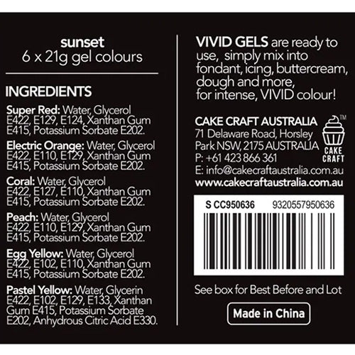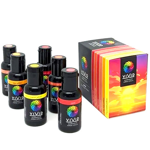 This Vivid Gel Colours Sunset 6 Pack includes 6 x gel food colours: