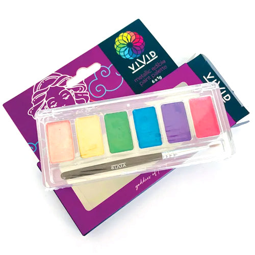 This Vivid Metallic Edible Paint Palette Iris is ideal for adding a touch of Metallic colour to your edible treats! To use simply activate with water, stir to form paste and paint.Ideal to paint on fondant, royal icing, macarons, buttercream & more. Include 6 colours and a brush.