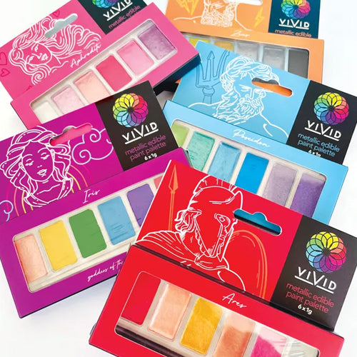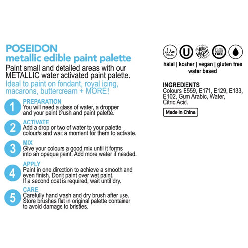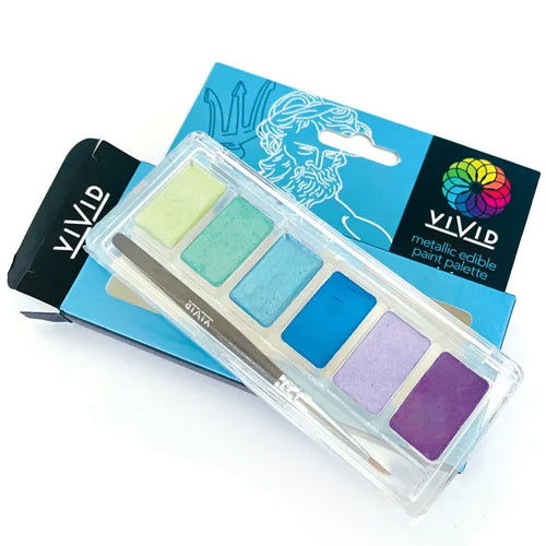 This Vivid Metallic Edible Paint Palette Poseidon is ideal for adding a touch of Metallic colour to your edible treats! To use simply activate with water, stir to form paste and paint.Ideal to paint on fondant, royal icing, macarons, buttercream & more. Include 6 colours and a brush.