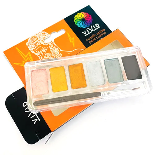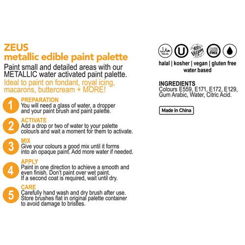 This Vivid Metallic Edible Paint Palette Zeus is ideal for adding a touch of Metallic colour to your edible treats! To use simply activate with water, stir to form paste and paint.Ideal to paint on fondant, royal icing, macarons, buttercream & more. Include 6 colours and a brush.