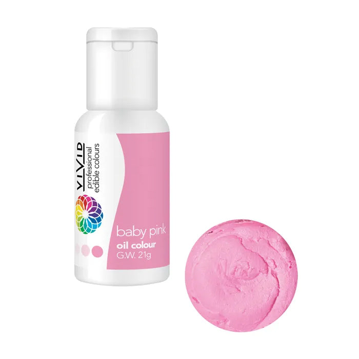 This Vivid Oil Based Colour BABY PINK is a ready to use food colouring specially made to mix with oil based mediums such as chocolate, ganache, fondant, icing, buttercream, dough and more. If you want a stronger colour, add more drops. For a lighter shade, use fewer drops. Mix the drops into the batter slowly until you get the colour you want. Comes in a 21g bottle. Made in China.