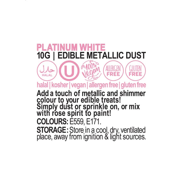 This Vivid White Metallic Edible Dust is great for adding a touch of Metallic colour to your edible treats! Comes in a 10g pot. Simply dust or sprinkle on, or mix with rose spirit to paint.