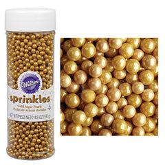 This gold sugar pearls by Wilton are a good way to add golden accents to your desserts or cupcakes.Not recommended for baked applications. Each pearl measures approximately 4mm. Net weight 4.8 oz. (136 g).