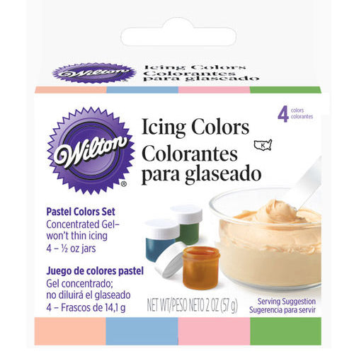 This Wilton Pastel Icing Colours Set by Wilton includes 4 jars of 1/2oz Wilton Icing Colours in Petal Pink, Creamy Peach, Willow Green and Cornflower Blue. Certified Kosher.