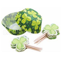 This Wilton Shamrock Shower Cupcake Combo Pack is a great and easy way to decorate your cupcakes. This pack includes 24 standard sized baking cups and 24 paper picks. Great for St Patricks Day themed cupcakes. Baking cups are made out of microwave safe paper and measures approximately 5cm base & 3cm wall. Paper party picks measures approximately 7.6cm high.