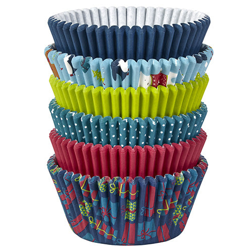 This Wilton Snowman & Friends Christmas Baking Cups includes 150 baking cups in 6 different patterns (approximately 25 cups of each pattern). Designs includes snowmen, presents, dots and solid colour lime green, blue and red baking cups. These baking cups are standard size measuring (5cm) in diameter. Great for Christmas themed cupcakes.