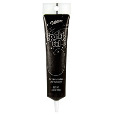 This Wilton Sparkle Gel in black is a ready to use black gel with a tinge of sparkle. To use simply squeeze the tube and start decorating. Great for writing messages, drawing dots, accents and more. Comes in a 99g resealable tube. Certified kosher.